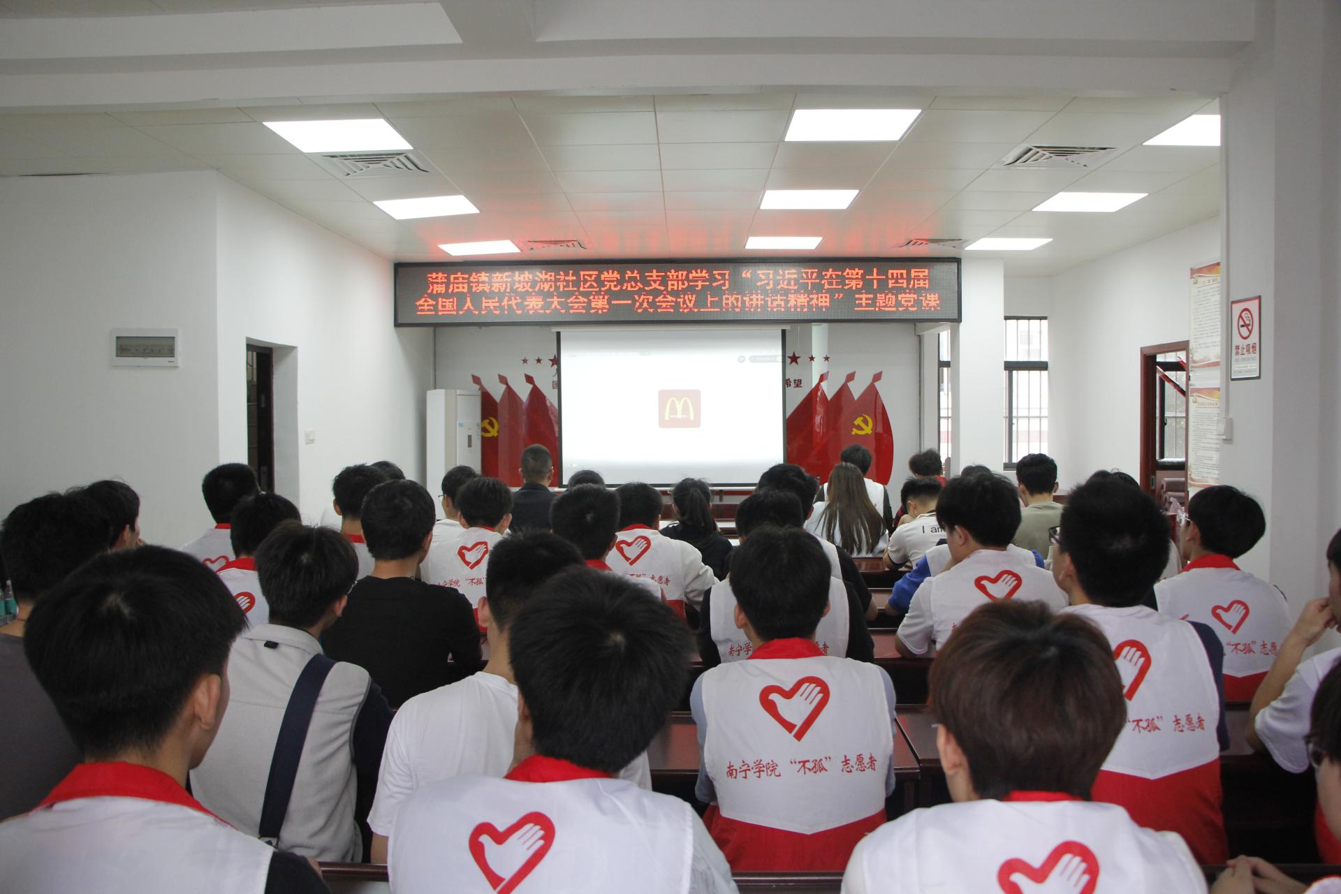 活动的当天,志愿者们早早的出发,前往新兴苑小区,并跟随新坡湖社区党支部学习“习近平在第十四届全国人民代表大会第一次会议上的讲话精神”主题党课活动。治国必先治党,党兴才能国强。青年学生要坚定历史自信,勇于攻坚克难,不断为强国建设、民族复兴伟业添砖加瓦、增光添彩!