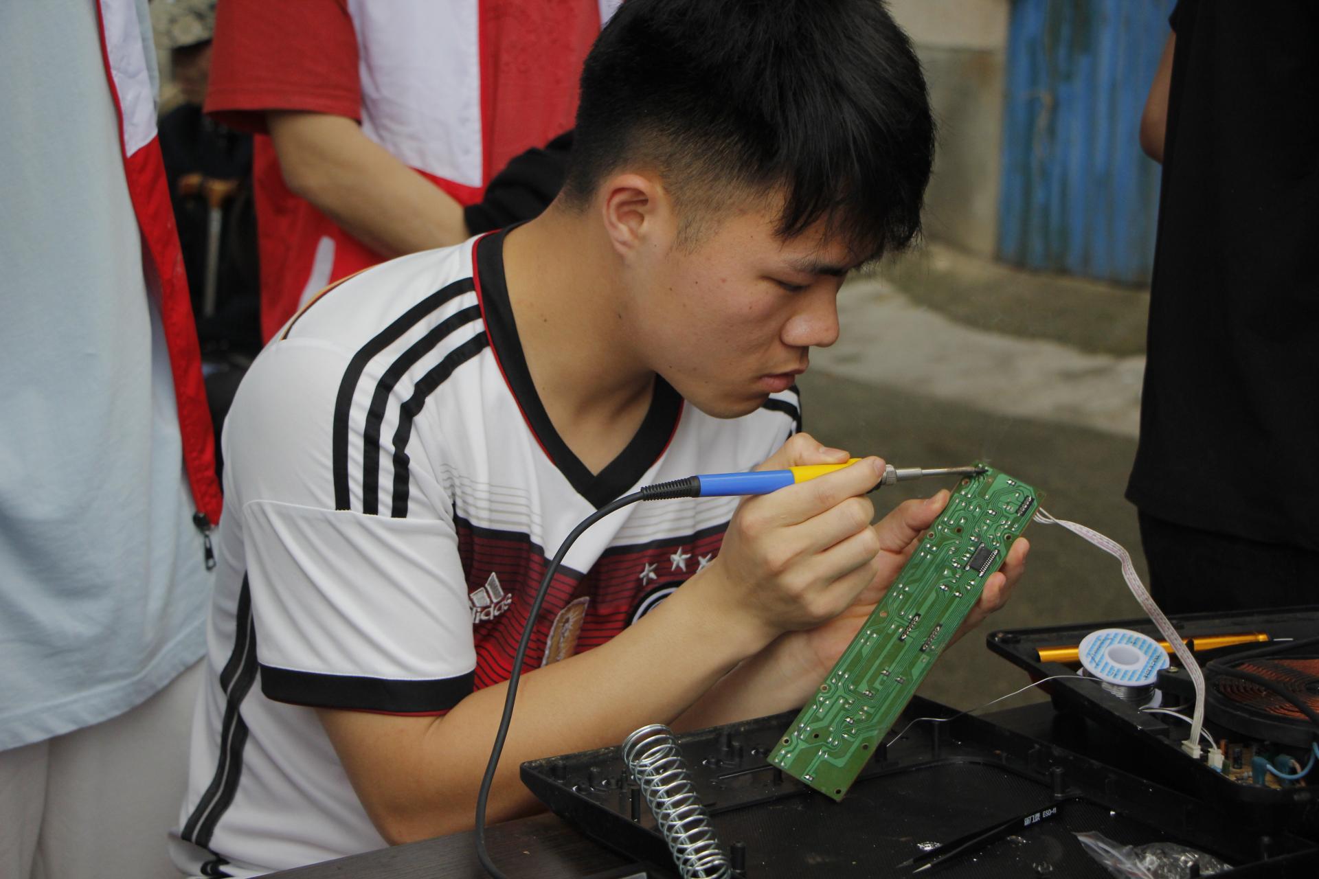 紧接着,党课学习结束后志愿者们在新兴苑小区开展用电安全等知识宣传,引导社区群众主动了解活动内容,并积极参与到本次活动中来。志愿者们干净利落的布置好场地摆放好义务维修所需的工具以及设备,志愿者在小区忙碌的身影,尤其是那一身红色马甲,吸引了社区群众驻足围观。社区群众纷纷携带故障的家用电器前来维修,其中包括电饭锅、热水壶、料理机等等家用小电器。志愿者们一一回答了群众们的问题,仔细查找处理故障,耐心地向大家讲解用电安全、家电使用和保养方法,并对无法修好的电器耐心地说明损坏原因,提供维修建议。
