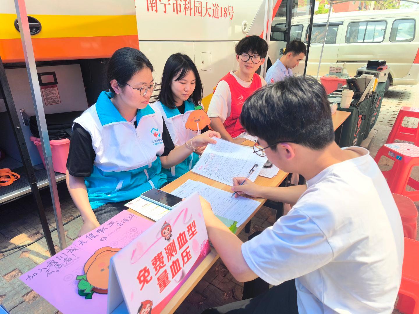 活动当天,南宁血站的采血车也来到校园,22名同学现场参与献血,总献血量达7600毫升,充分展现师生强烈的社会责任感和奉献精神。