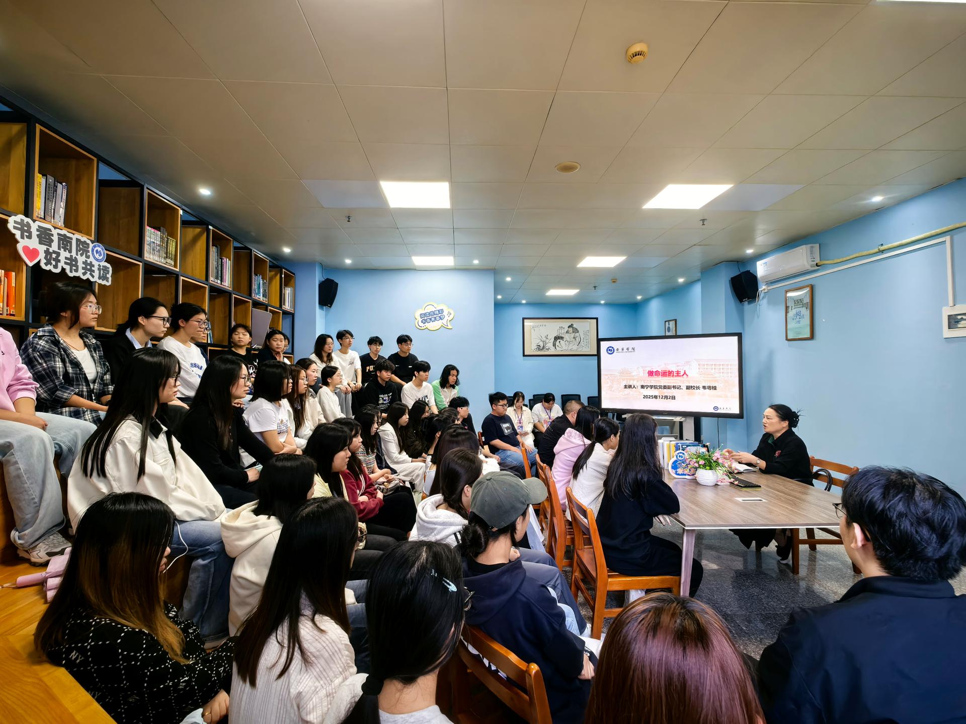 为助力南院学子树立崇高的人生理想与正确的价值观,推动个人成长与自我超越的步伐,12月2日下午,在图书馆二楼阅读分享空间举办了《了凡生意经》师生共读沙龙。此次活动由南宁学院党委副书记、副校长韦粤桂主持,在传统智慧与现代认知的激烈碰撞中,共同解锁生命成长的深层密码。来自商学院的50多名师生代表参加。