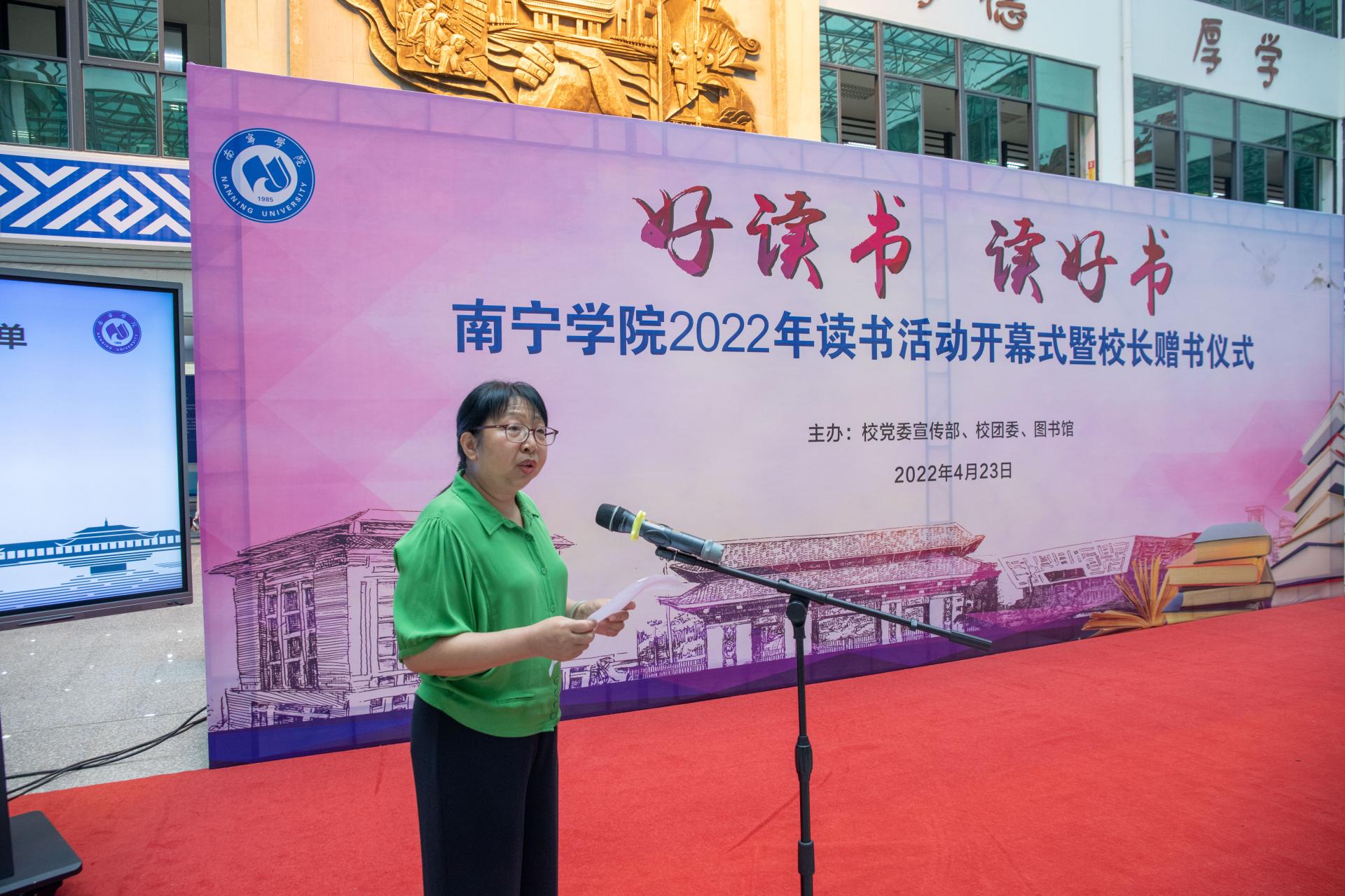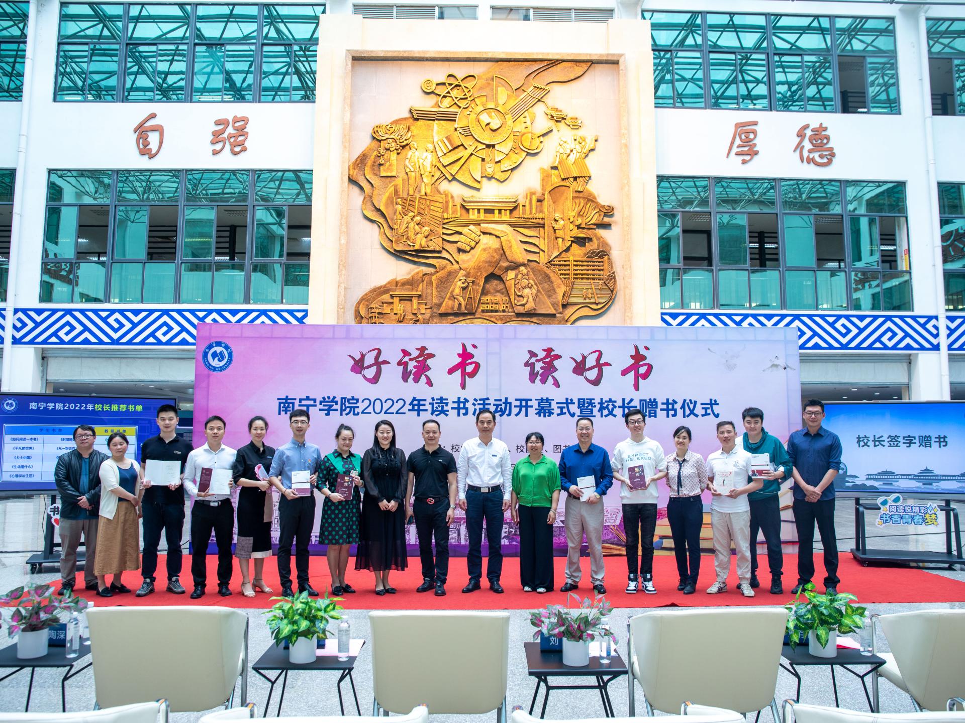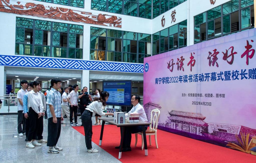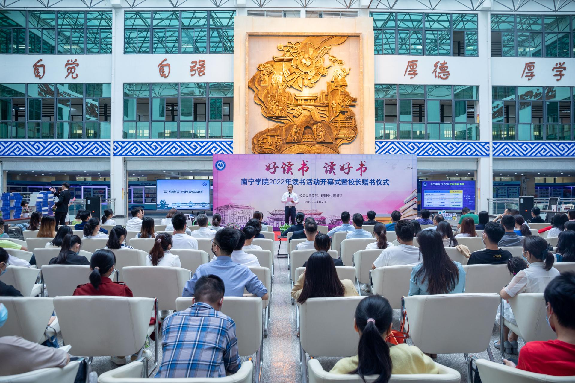 温馨校园,宁静求学;悠悠南院,淡淡书香。在第27个世界读书日将到来之际,南宁学院2022年读书活动开幕式暨校长赠书仪式于4月23日上午在学校图书馆二楼中庭举行,拉开了主题为“好读书读好书”系列读书活动的序幕。学校领导及师生代表120余人参加活动。