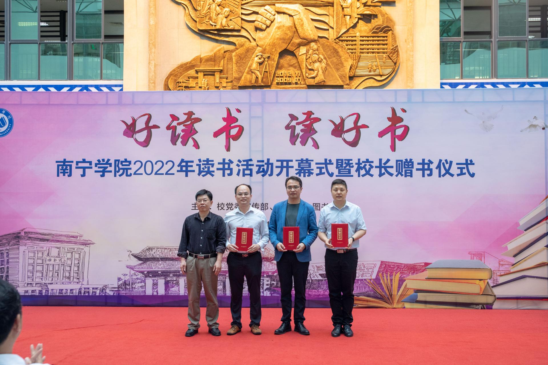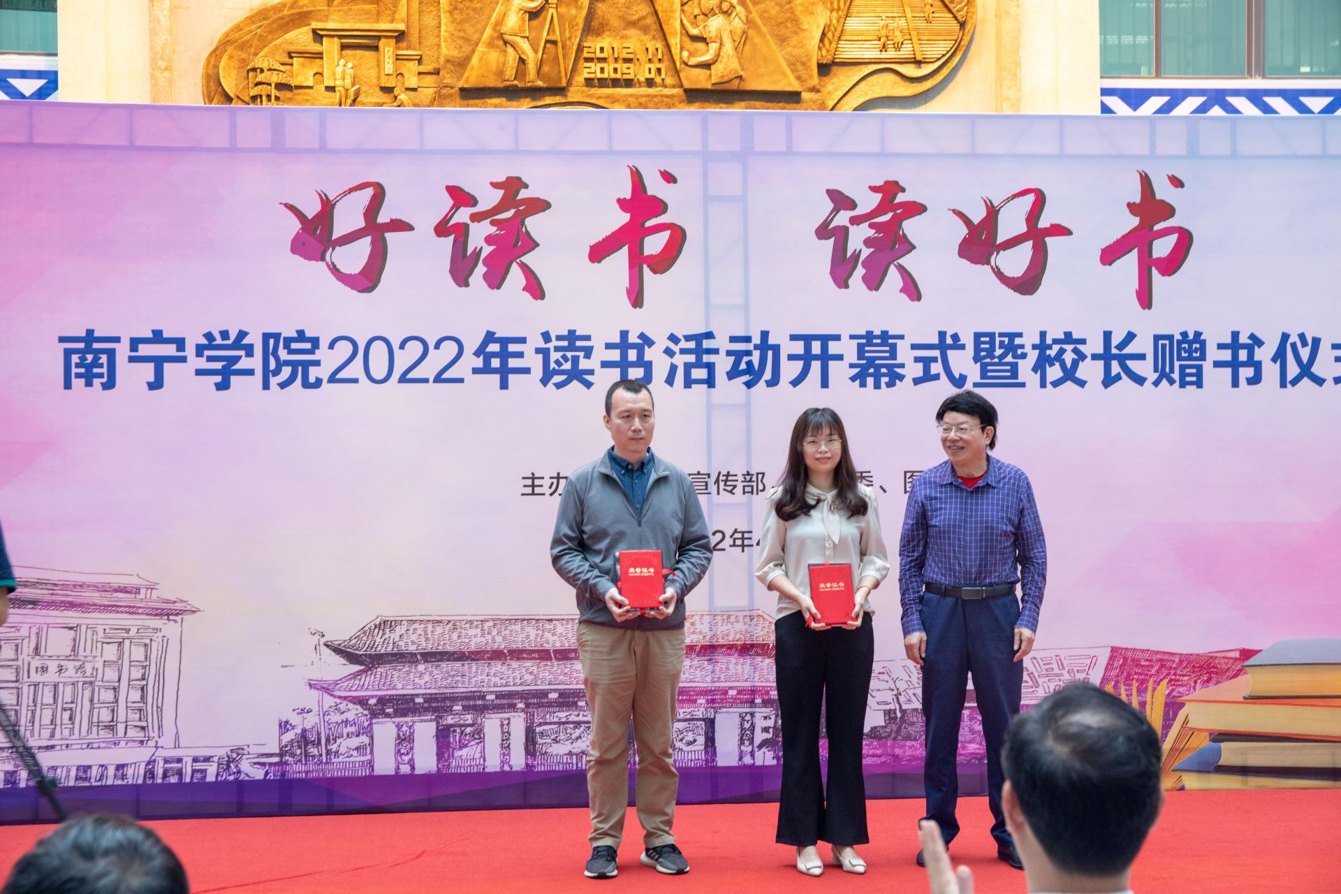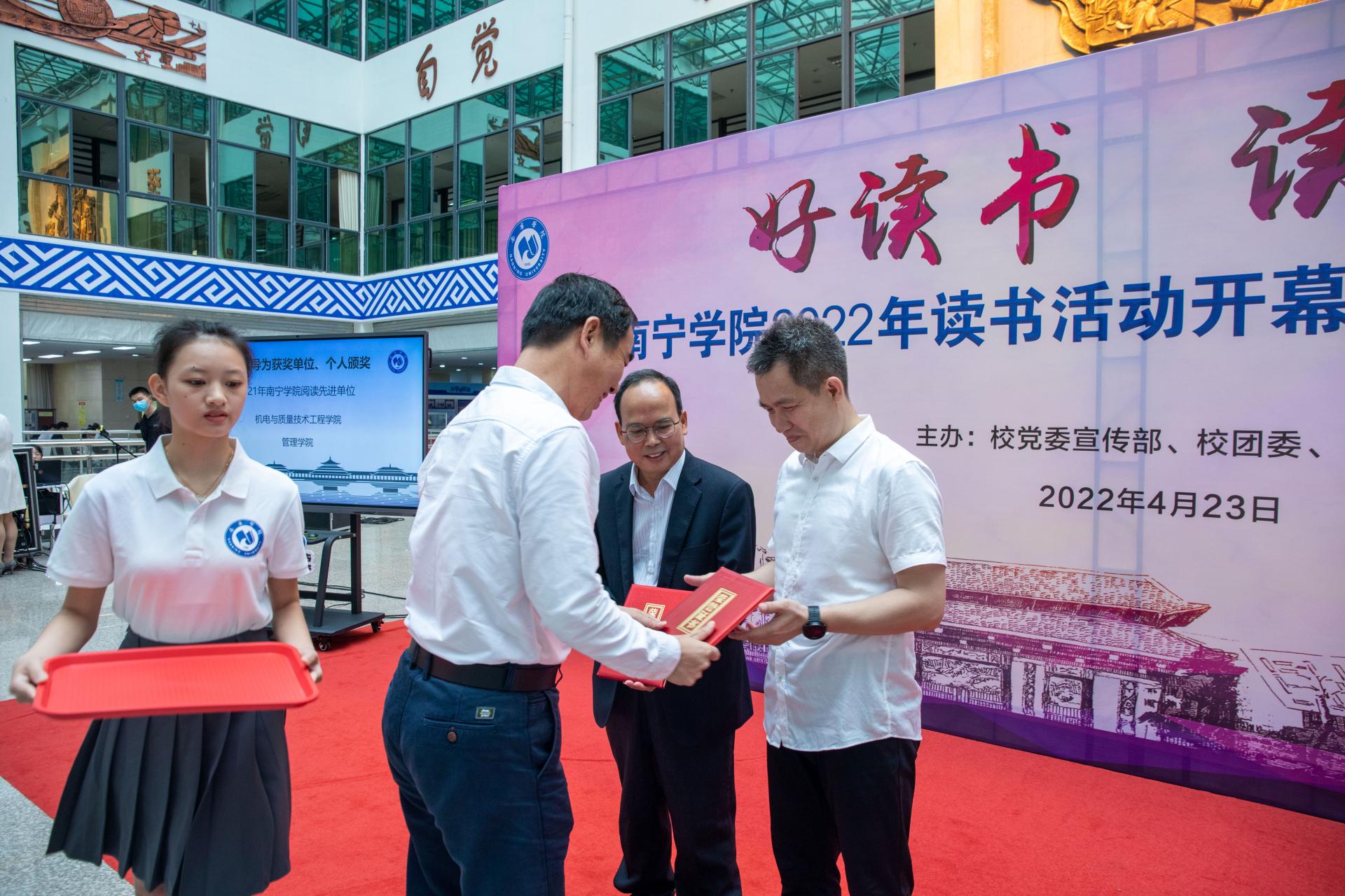 开幕式上,学校图书馆馆长谢清宣布获得“2021年南宁学院阅读先进单位”“2021年南宁学院积极荐书单位”“2021年南宁学院勤奋读者”名单。学校党委书记刘彪、校长李栋学,学校党委副书记、纪委书记覃存民,副校长李陶深、龚击分别为获奖单位、个人颁奖。
