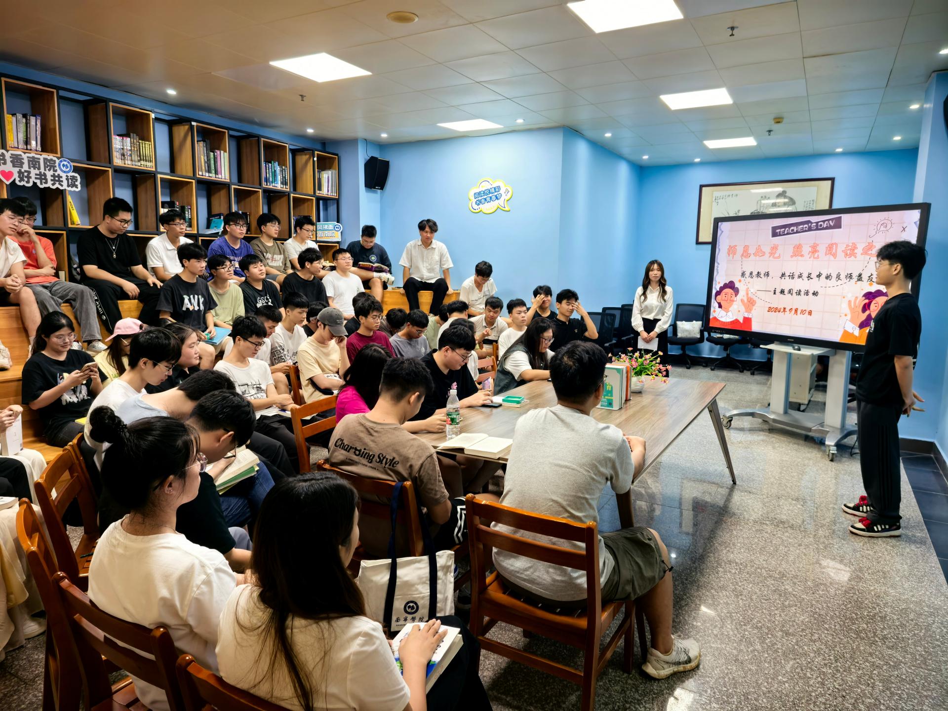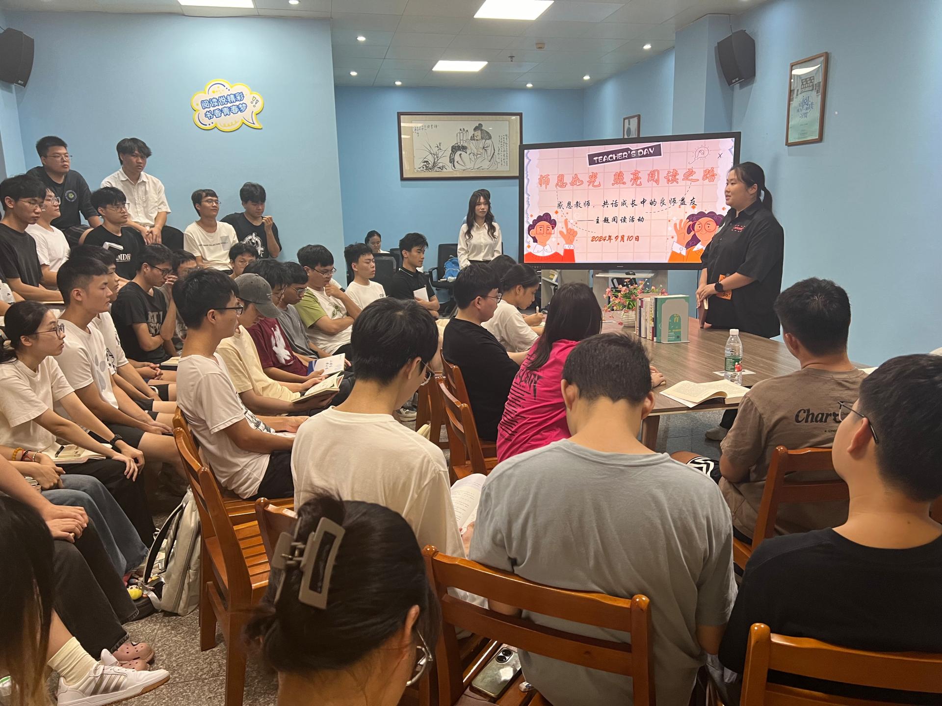 随着活动接近尾声,全体人员齐声诵读对老师的祝福:“一支粉笔,写尽古往今来;三尺讲台,见证四季春秋。在教师节,愿所有老师生活如灿烂星辰般闪耀,您的教诲之语,永润学子之心”,饱含深情的诵读回响在阅读分享空间。