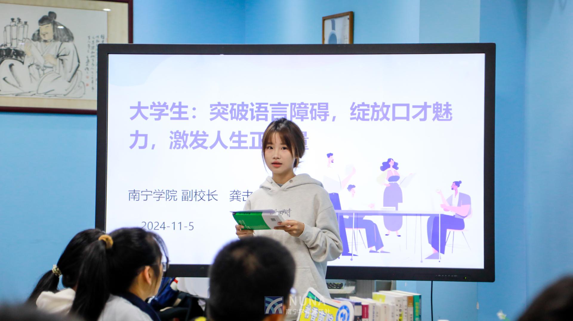 为鼓励大学生跨越语言障碍,展现口才魅力,培养良好的阅读习惯,营造浓厚的书香南院氛围,11月5日下午,《语言的突破》师生共读沙龙活动在图书馆二楼阅读分享空间成功举办,活动由南宁学院副校长龚击主持,来自交通运输学院的50多名师生代表参加。