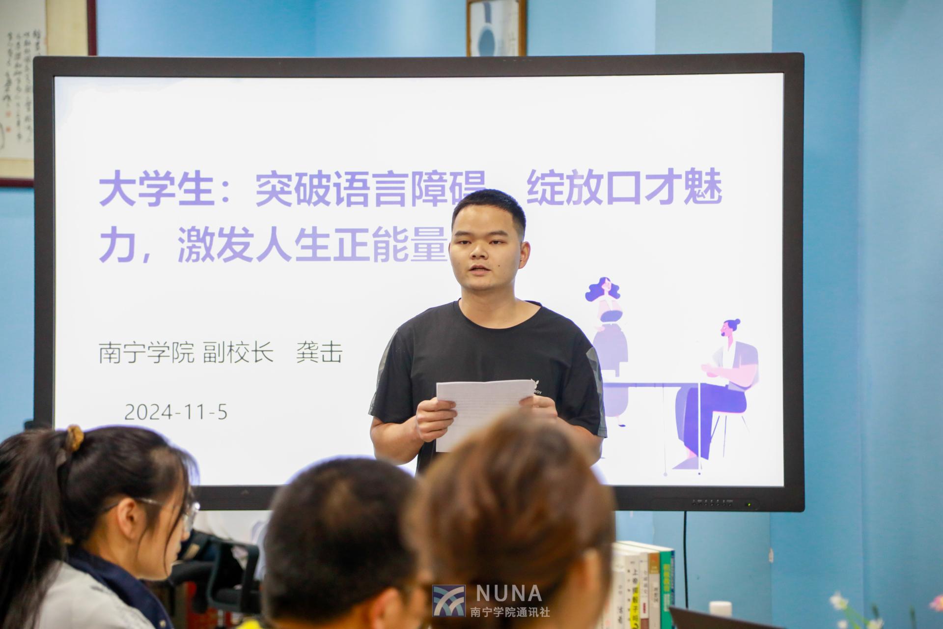活动伊始,龚副校长对《语言的突破》一书进行了简要介绍,该书作为卡耐基的成名之作,与《人性的优点》、《人性的弱点》并列为卡耐基最畅销的三大著作。书中融合了公开演说术、心理学和商业谈判技巧,为读者提供了克服恐惧、建立自信、自然发挥潜能以及在各种场合发表恰当言论的实用指南,对大学生的学习和生活具有深刻的启示意义。