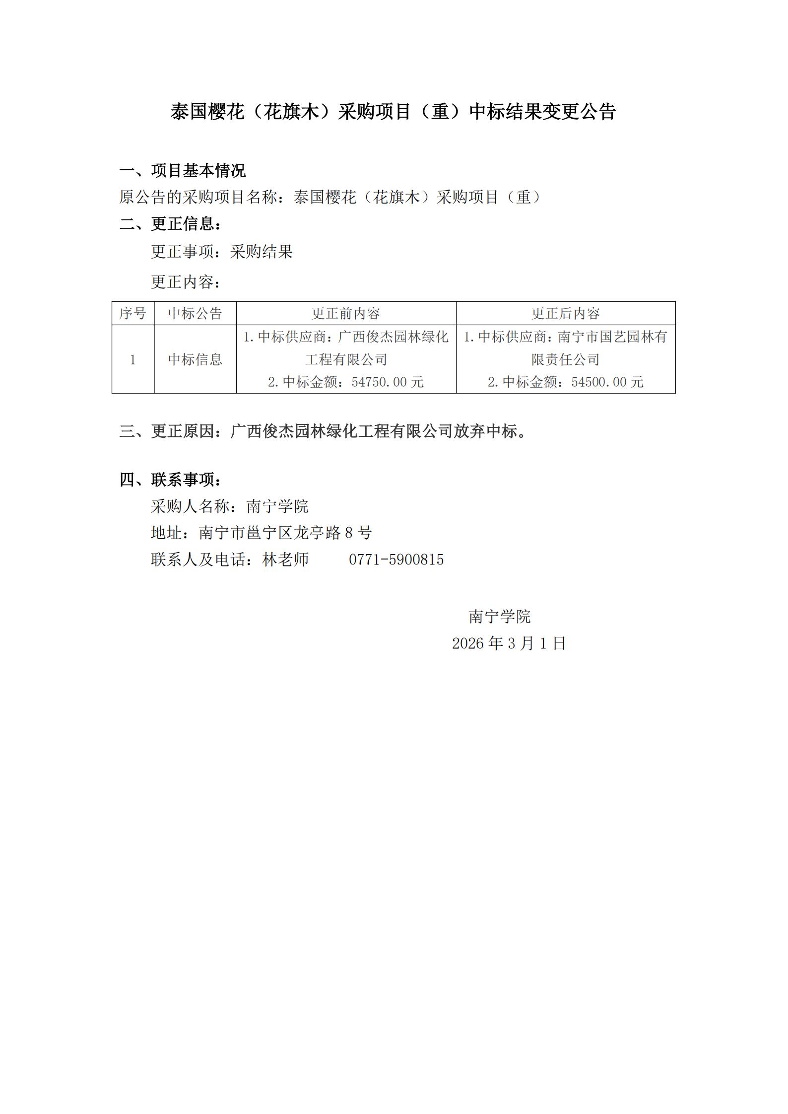 泰国樱花(花旗木)采购项目(重)中标结果变更公告