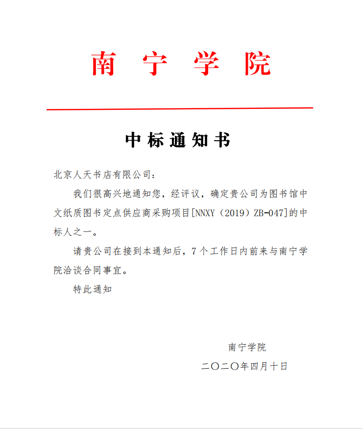 中标通知书(图书馆中文纸质图书定点供应商采购项目-人天)