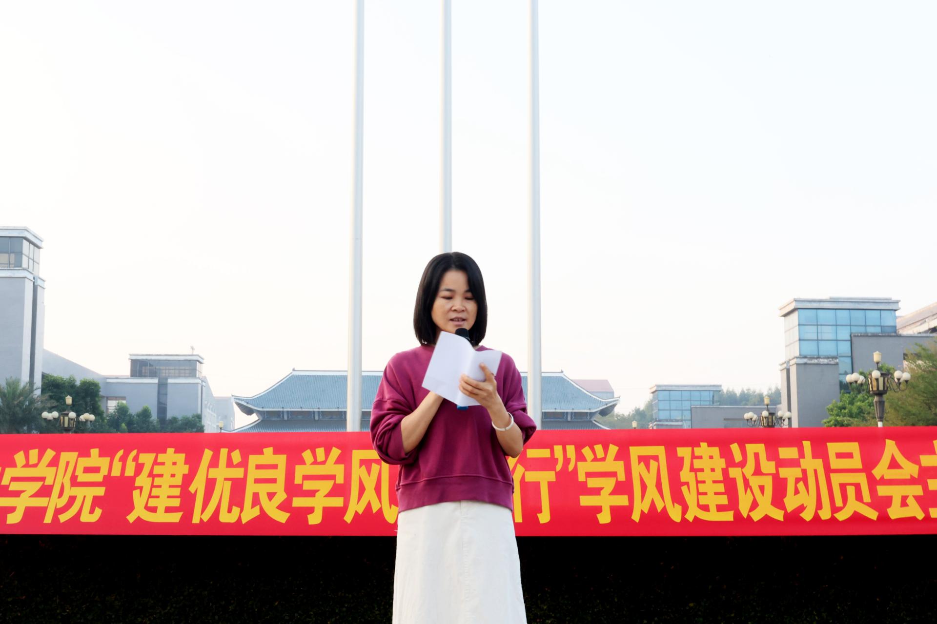 最后,学院党委书记陆海兰进行动员讲话。陆海兰书记强调校风是学校发展的基石,可以塑造师生的精神品质,广大师生要深刻认识校风建设的重要意义,着力解决校风建设中纪律意识淡薄、学习氛围不浓、师生关系优化等问题。陆海兰书记针对学院师生齐心协力,共创优良校风提出几点建议:一是领导班子要发挥引领作用;二是教师要成为校风建设的主力军;三是广大同学要积极参与,从我做起。校风建设是一个长期而艰巨的任务,它需要我们每一个人持续不断地努力。