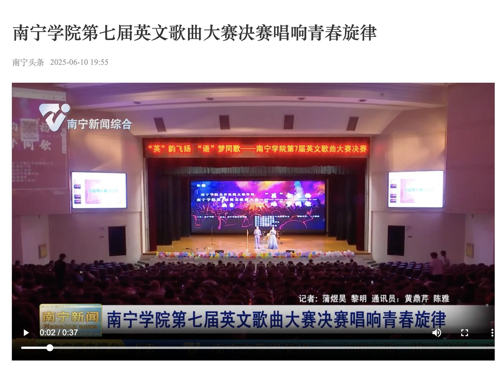 1.南宁电视台:南宁学院第七届英文歌曲大赛决赛唱响青春旋律 https://jxpub.nntv.cn/s/202506/10/AP684823e65e0ebda167bf3d91.html
