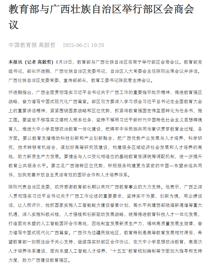 【媒体看南院】中国教育报、广西日报、广西广播电视台等媒体报道教育部与广西壮族自治区举行部区会商会议