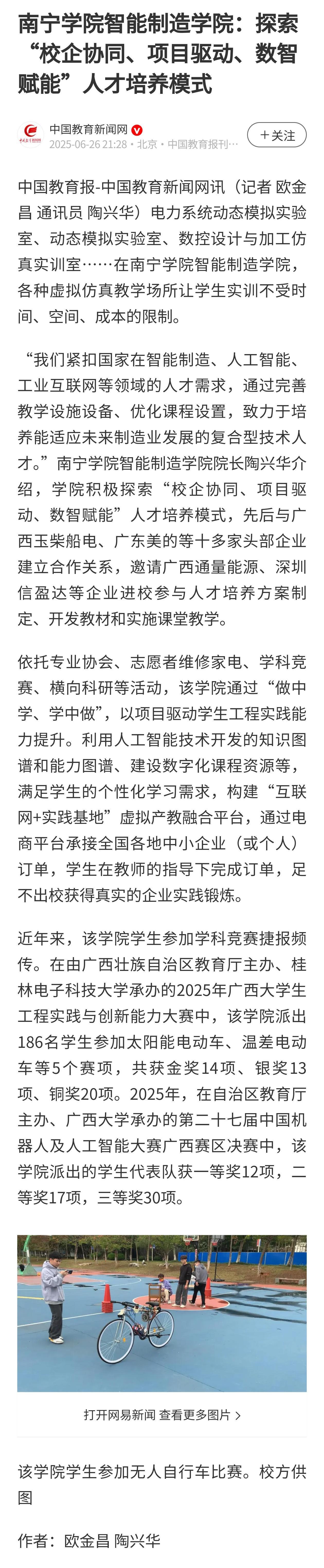 【媒体看南院】中国教育新闻网报道南宁学院智能制造学院:探索“校企协同、项目驱动、数智赋能”人才培养模式
