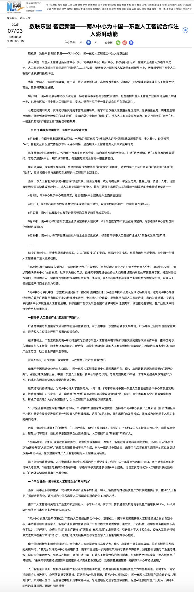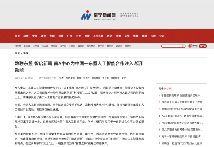 2.南宁日报:《数联东盟 智启新篇——南A中心为中国—东盟人工智能合作注入澎湃动能》http://www.nnwb.com/nnwb/20250703/mhtml/page_01_content_000.htm#page1