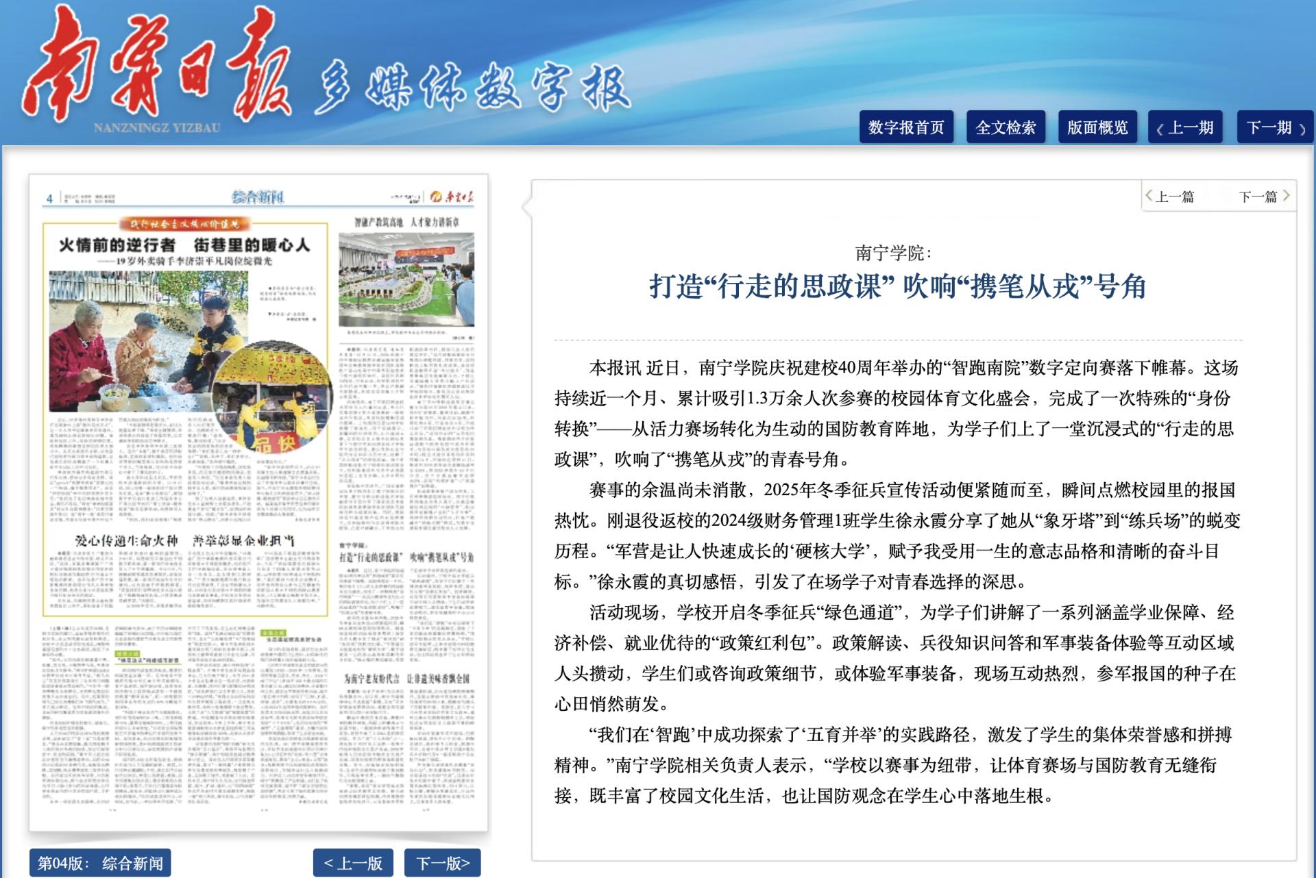 1.南宁日报:南宁学院:打造“行走的思政课” 吹响“携笔从戎”号角 http://www.nnrb.com.cn:8080/nnrb/20251218/html/page_03_content_005.htm