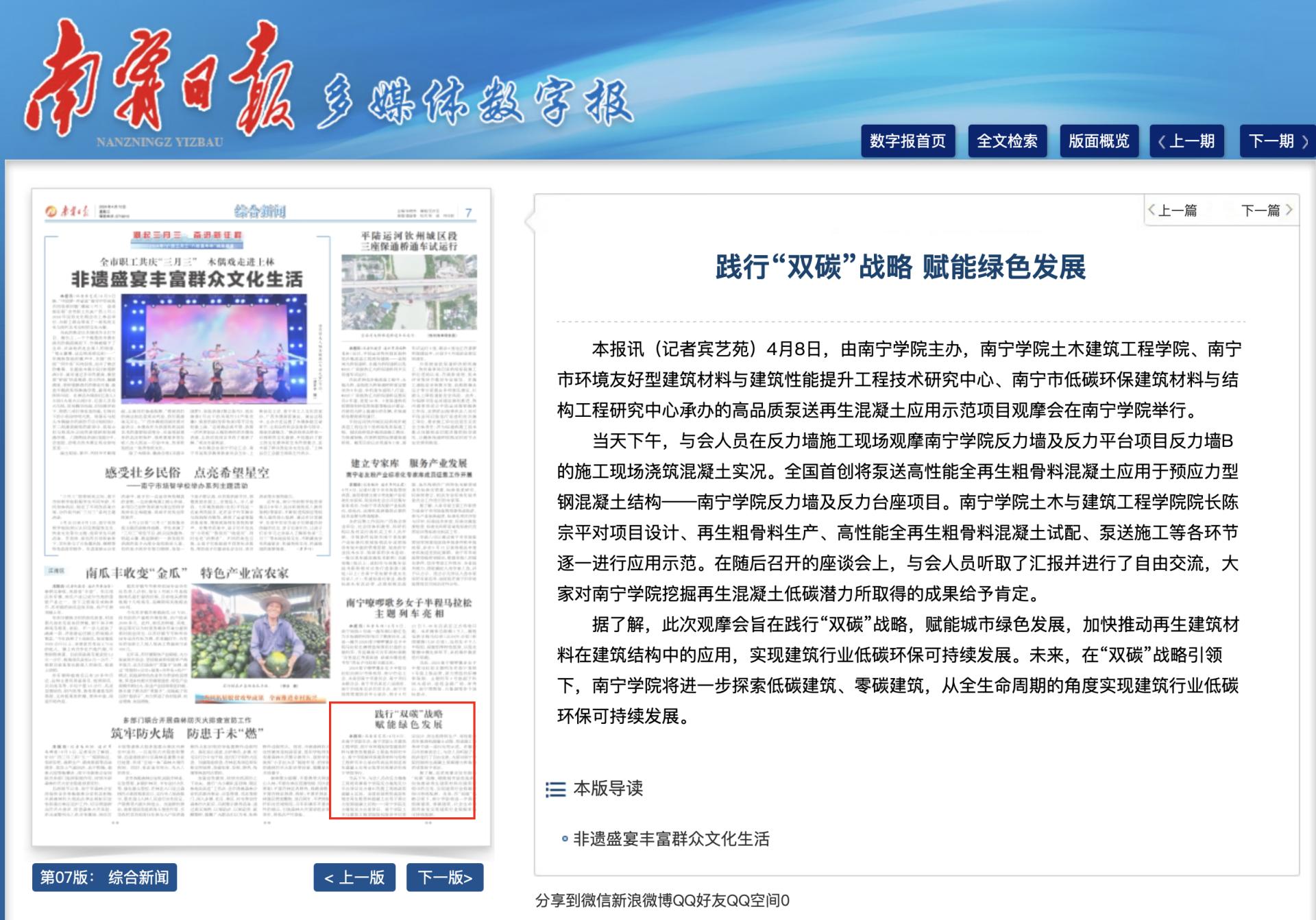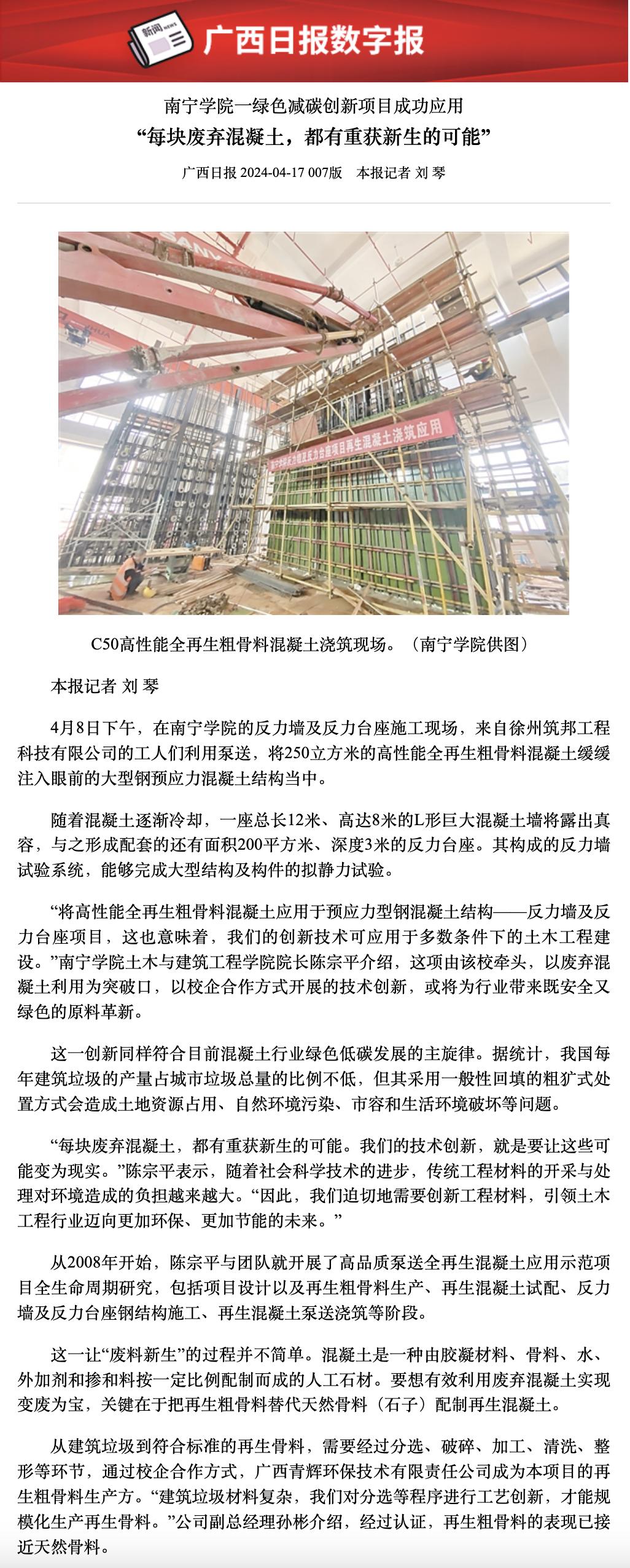 1.广西日报:南宁学院一绿色减碳创新项目成功应用——“每块废弃混凝土,都有重获新生的可能” https://ssw.gxrb.com.cn/json/interface/epaper/api.php?name=gxrb&date=2024-04-17&code=007&xuhao=1