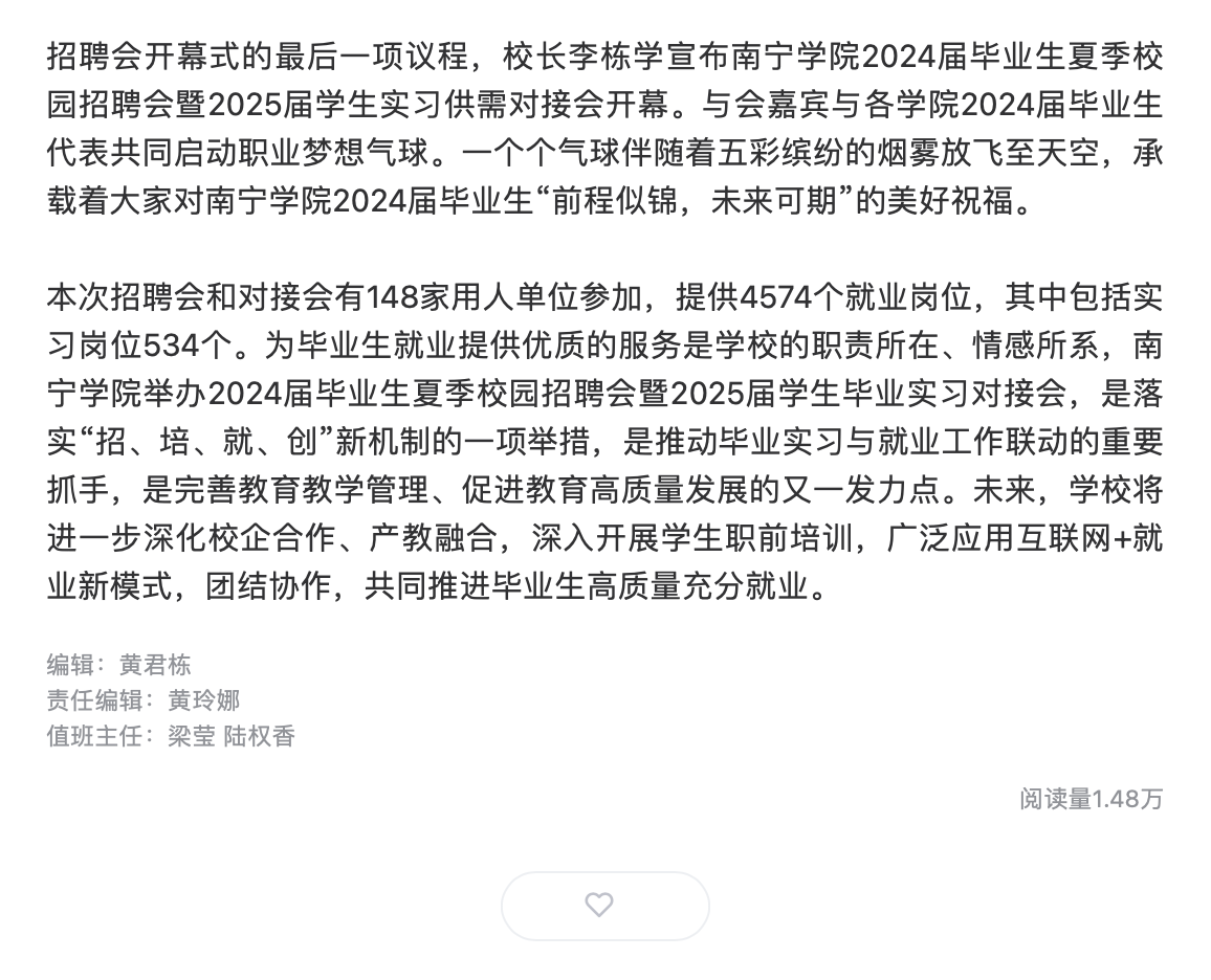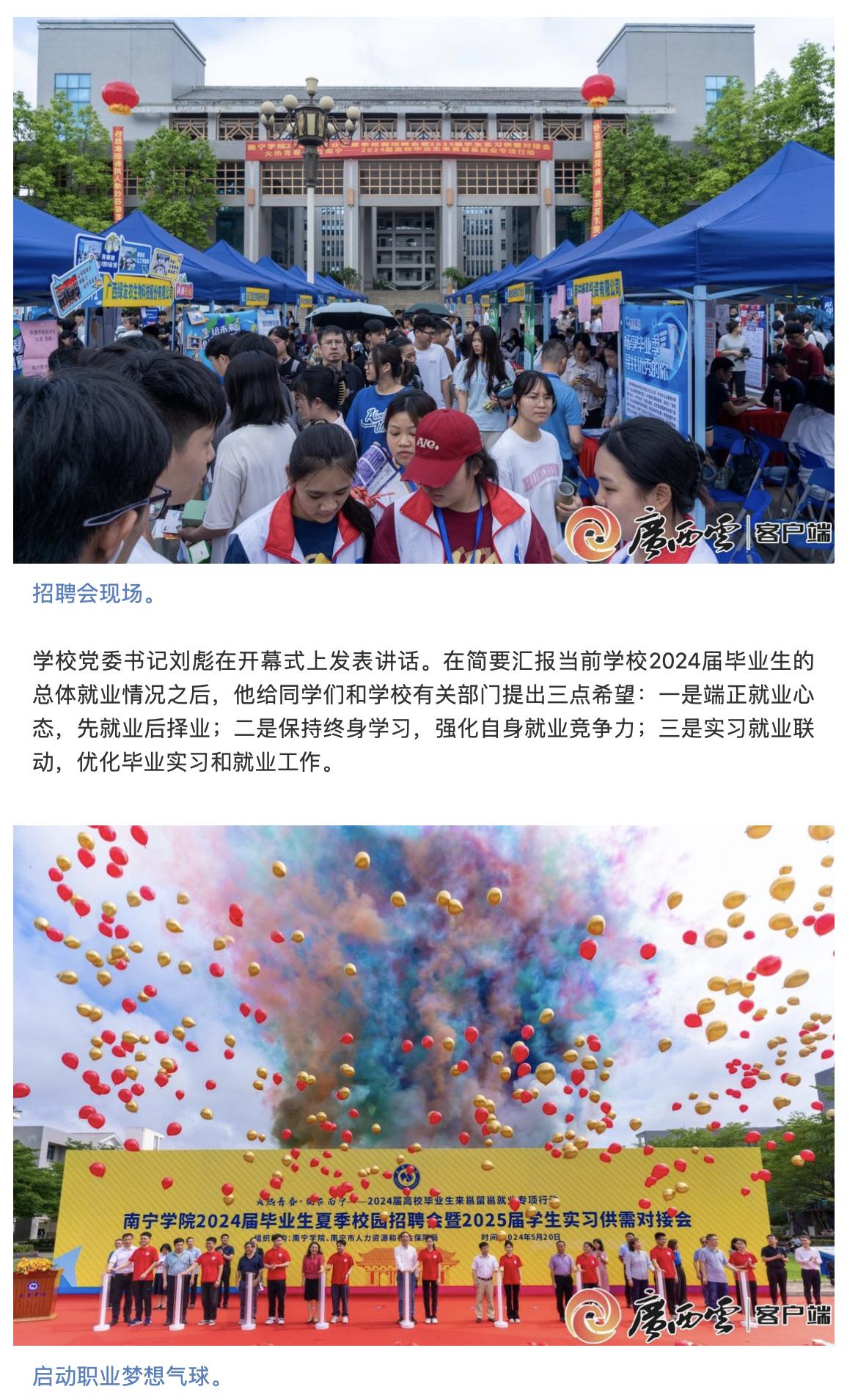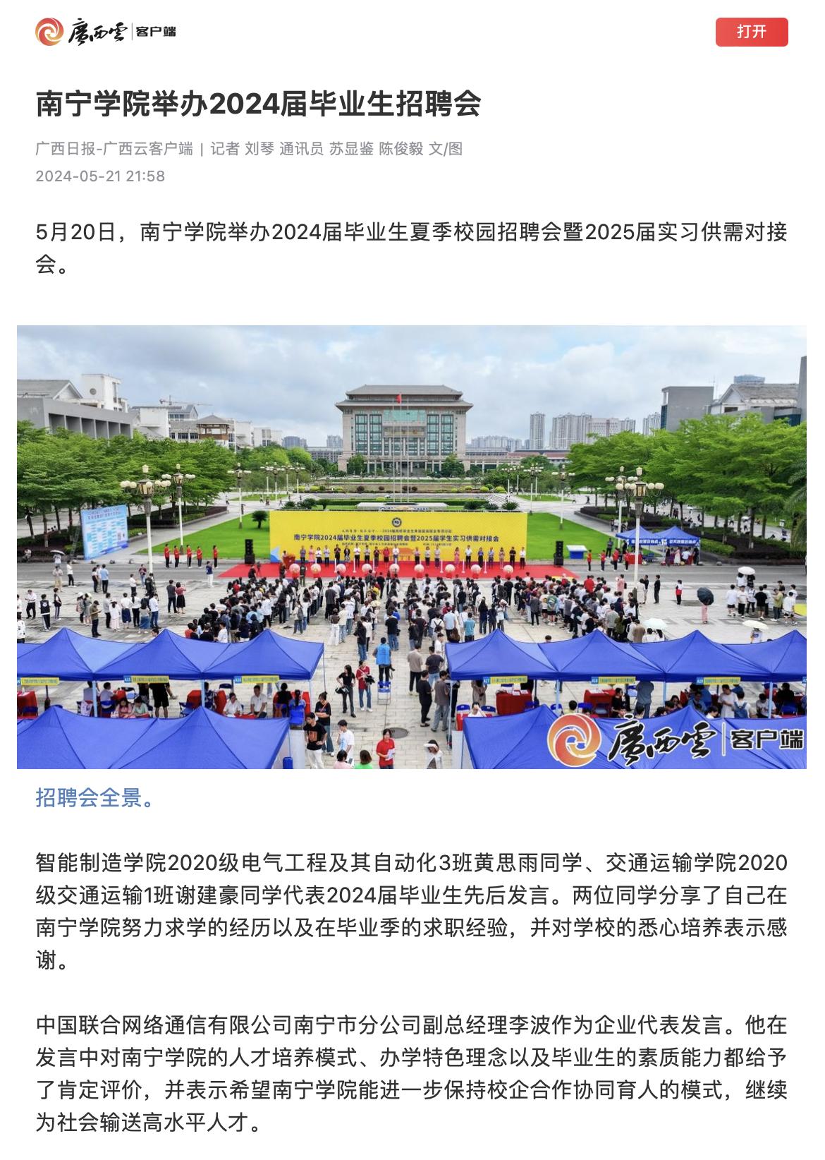 1.广西日报:南宁学院举办2024届毕业生招聘会 https://apph5.cloudgx.cn/article/sync1792917903469654016