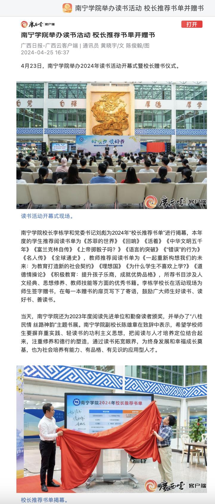 1.广西日报:南宁学院举办读书活动 校长推荐书单并赠书 https://apph5.cloudgx.cn/article/sync1783415009399214080