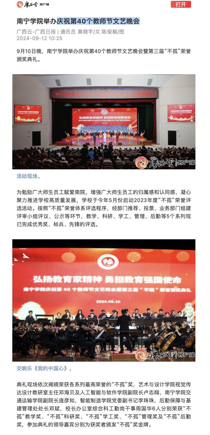 1.广西日报:南宁学院举办庆祝第40个教师节文艺晚会 https://apph5.cloudgx.cn/article/sync1834055732286255104