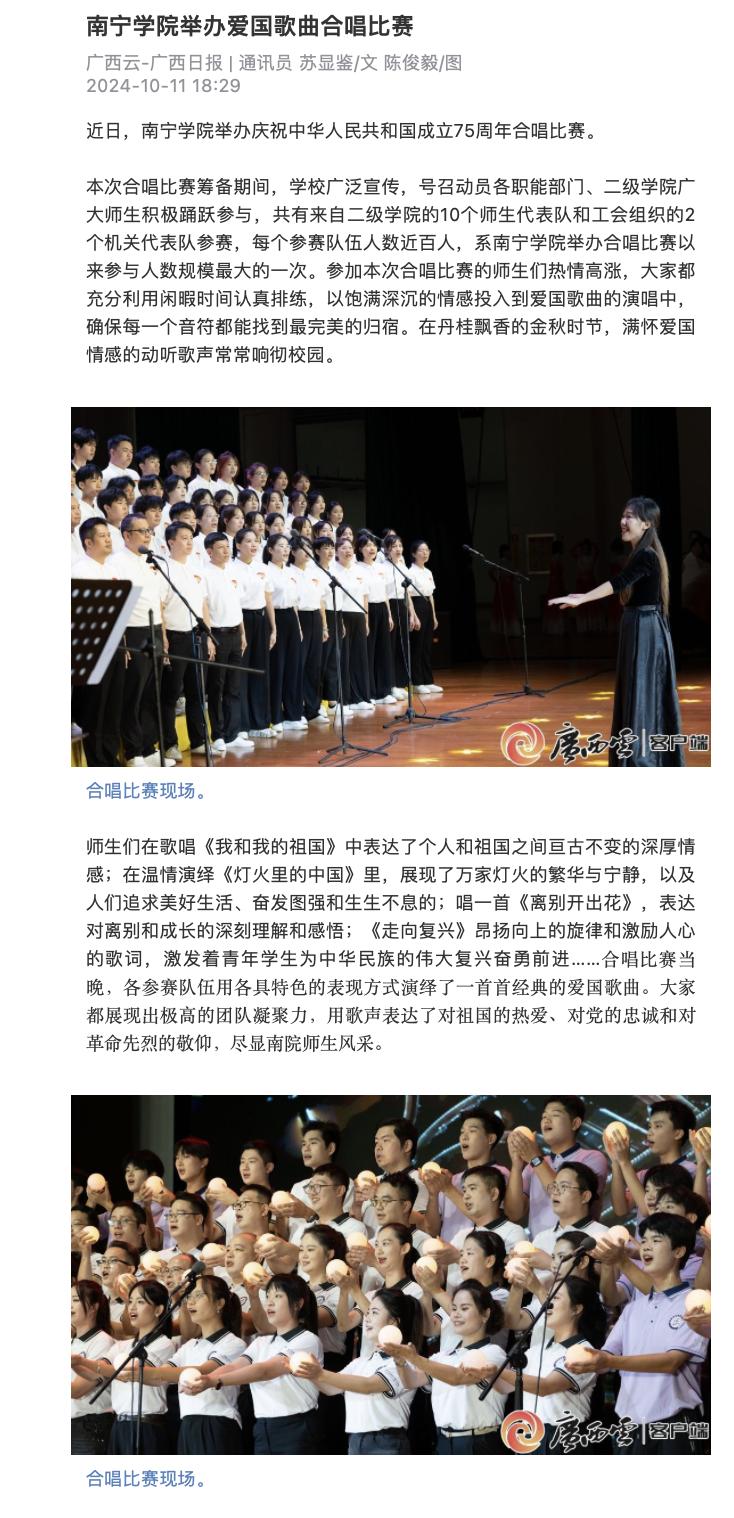 1.广西日报:南宁学院举办爱国歌曲合唱比赛 https://apph5.cloudgx.cn/article/sync1844686839631163392