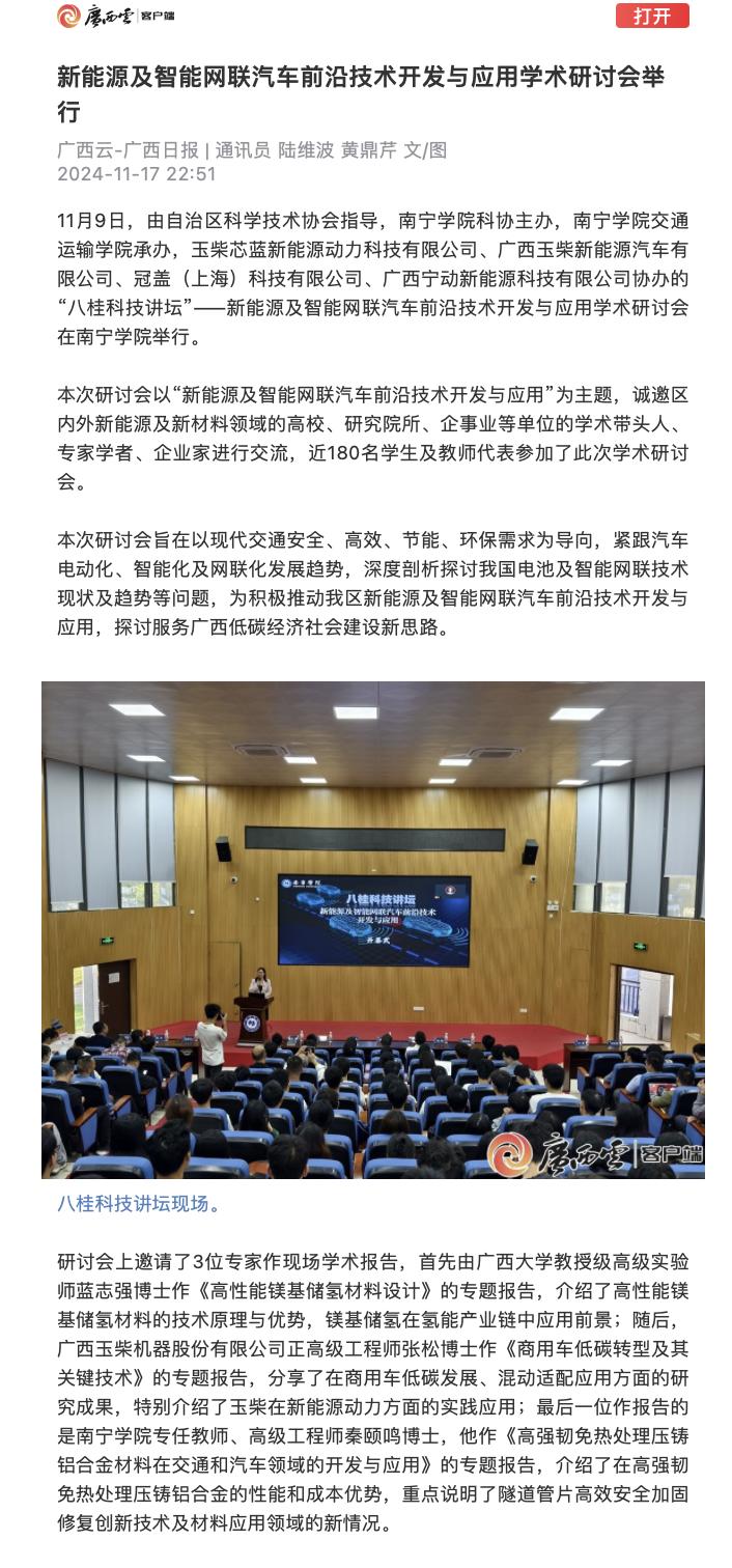 1.广西日报:新能源及智能网联汽车前沿技术开发与应用学术研讨会举行 https://apph5.cloudgx.cn/article/sync1858161026191130624
