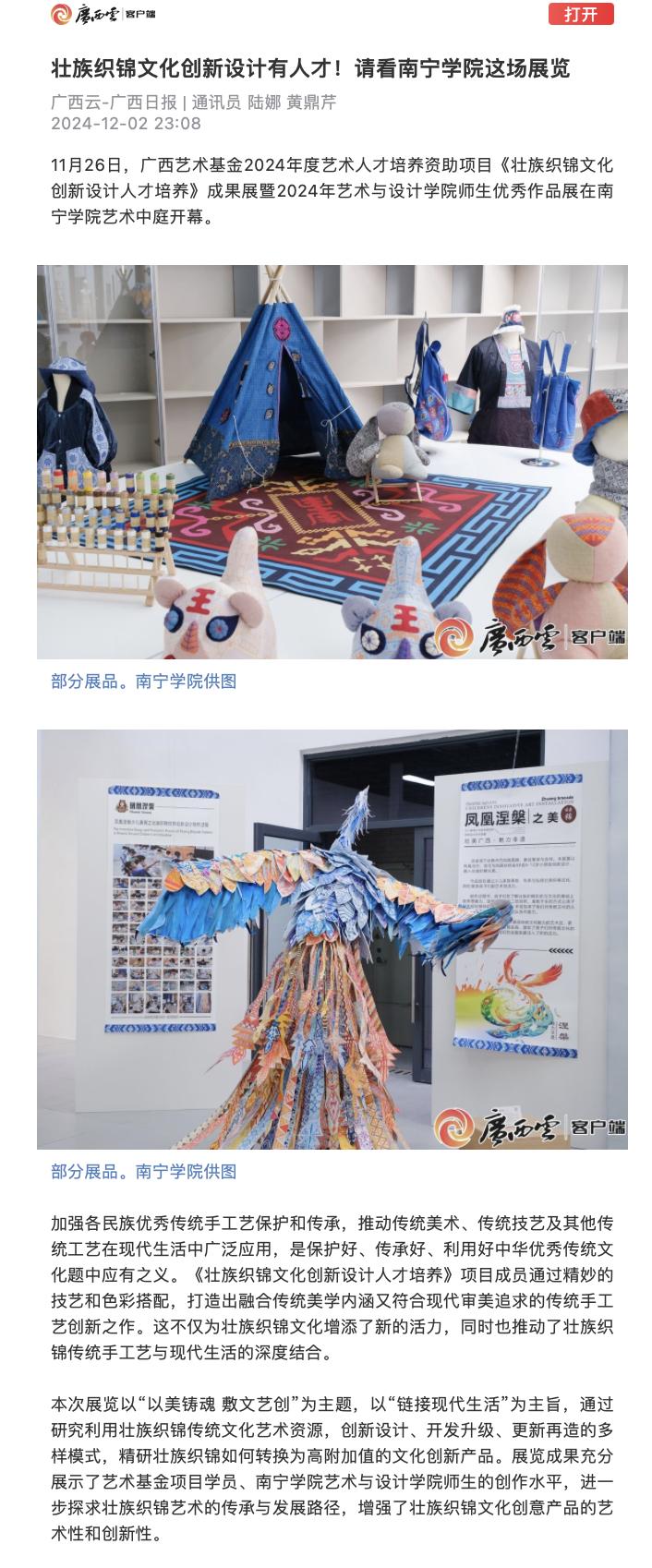 1.广西日报:壮族织锦文化创新设计有人才!请看南宁学院这场展览 https://apph5.cloudgx.cn/article/sync1863601096999755776