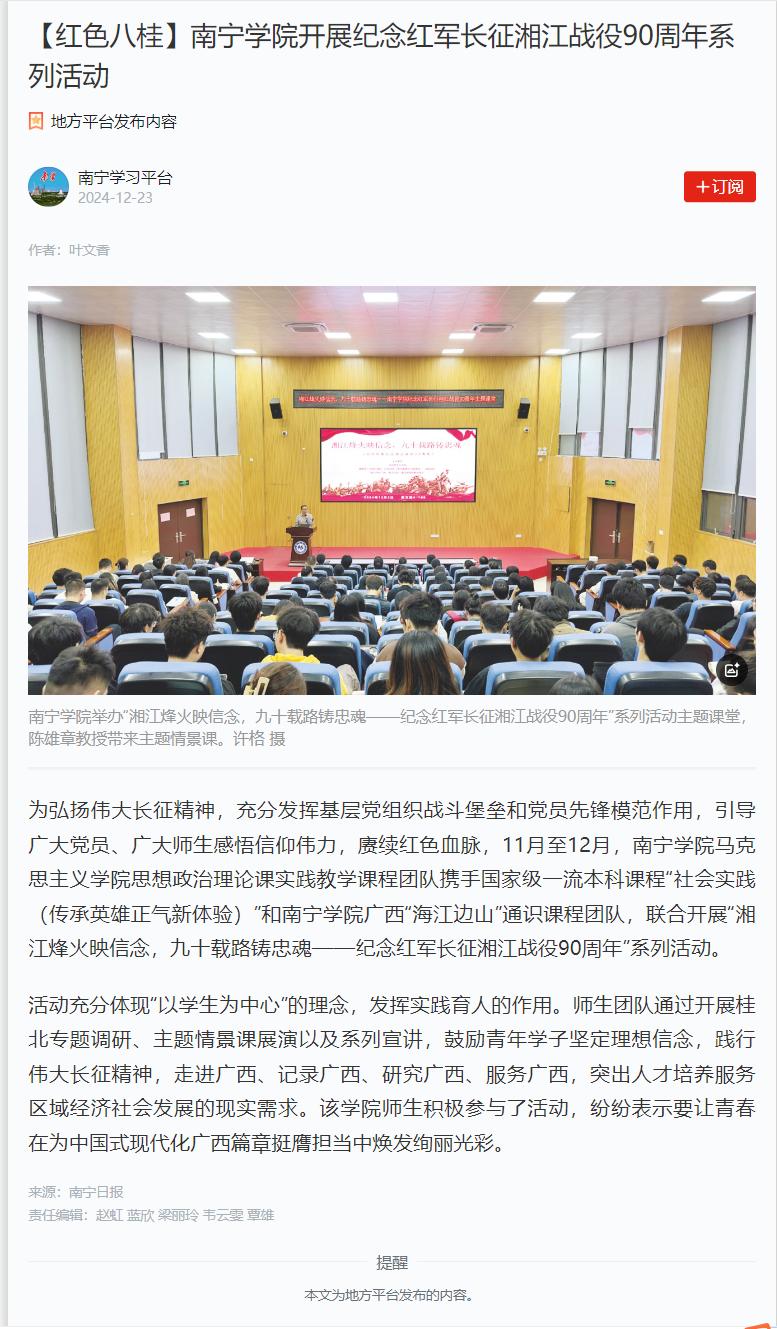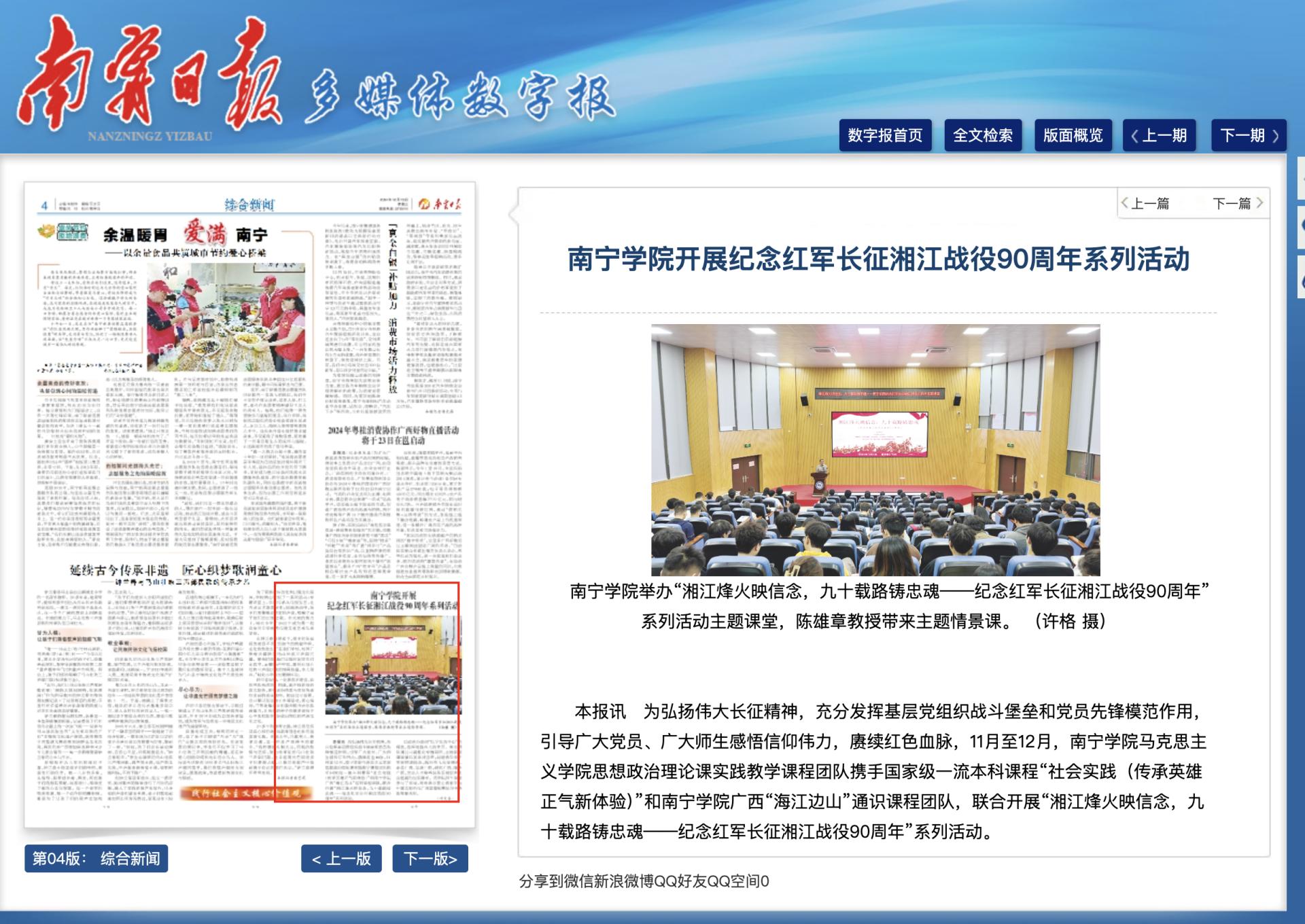 1.南宁日报:南宁学院开展纪念红军长征湘江战役90周年系列活动 http://www.nnrb.com.cn/nnrb/20241218/html/page_03_content_002.htm