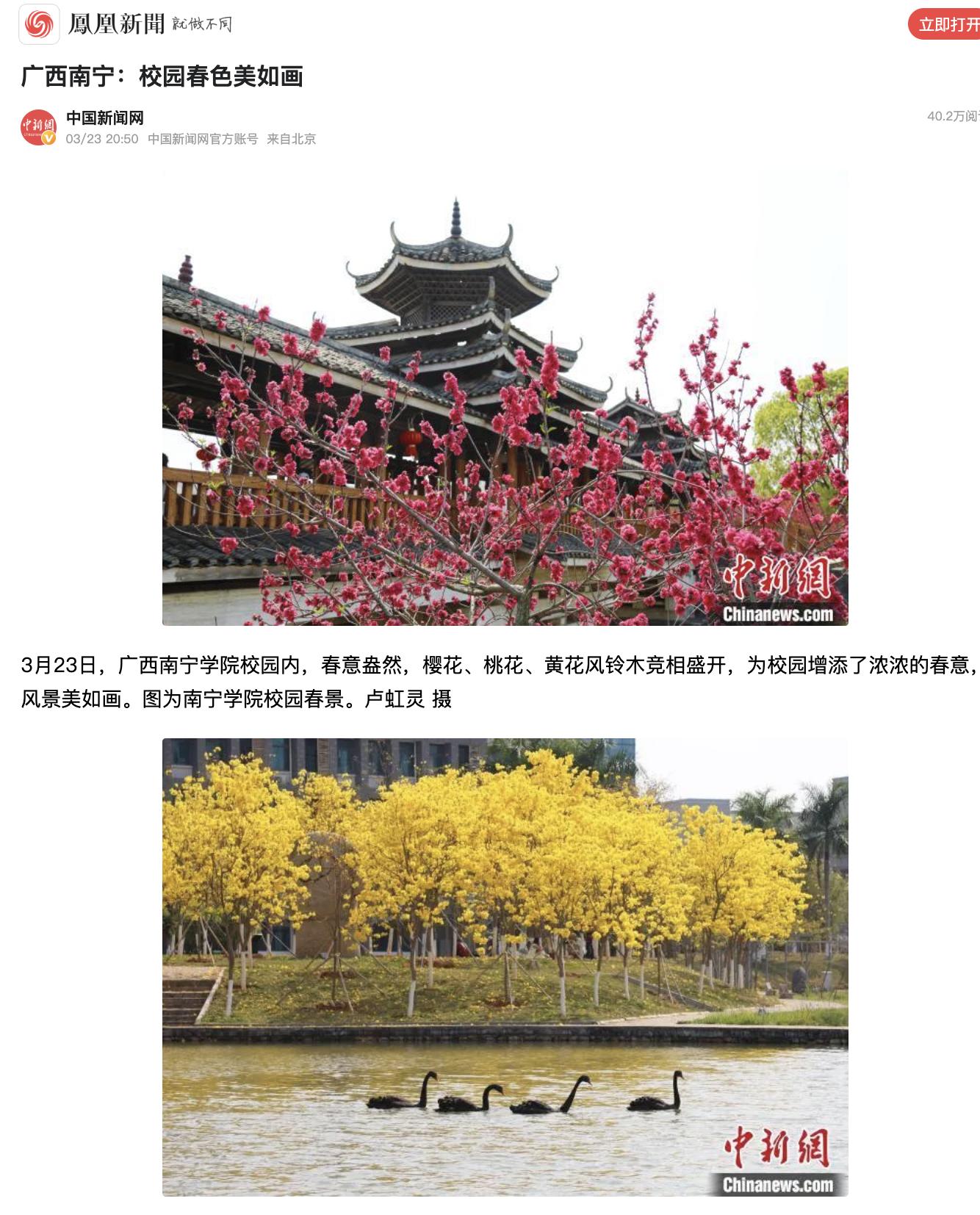 【媒体看南院】中新网、学习强国、今日头条、凤凰新闻、搜狐新闻等多家媒体报道南宁学院校园春色美如画