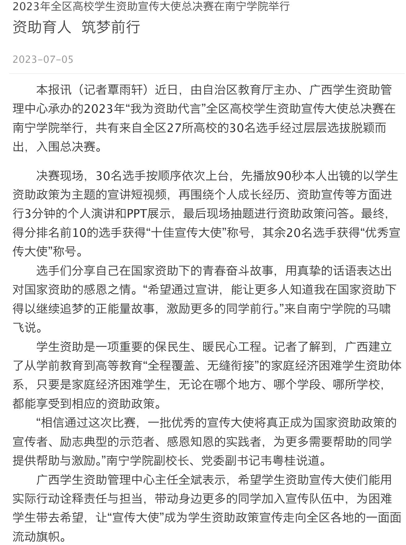 【媒体看南院】南宁日报报道2023年全区高校学生资助宣传大使总决赛在南宁学院举行、