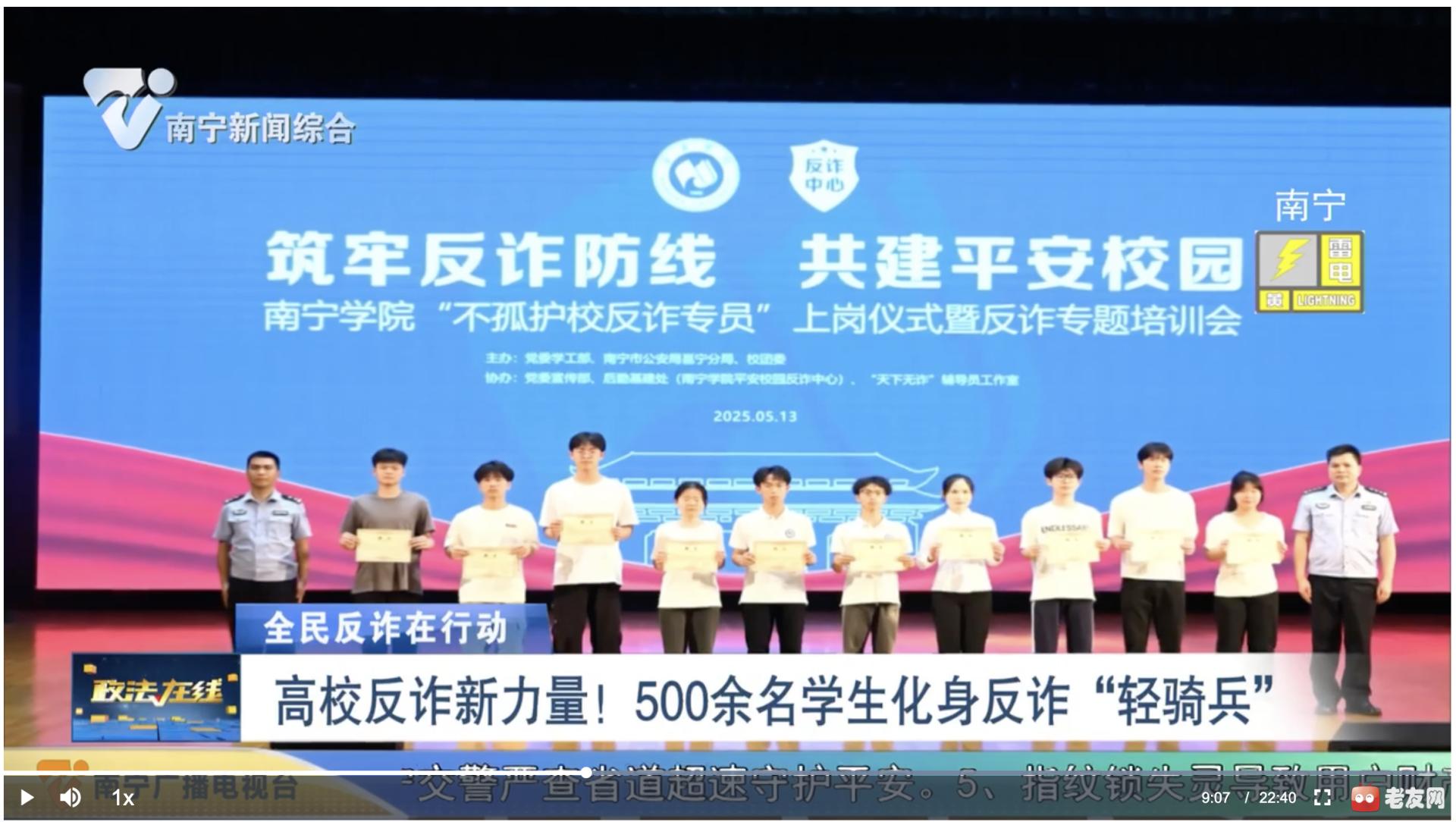 【媒体看南院】南宁电视台报道南宁学院召开“不孤护校反诈专员”上岗仪式暨反诈专题培训会